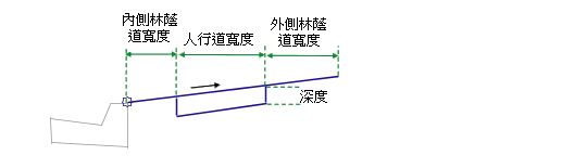 從貼附點以指定的坡度向外插入內側草坪、人行道和外側草坪林蔭道連接。透過指定零寬度可以省略草坪。