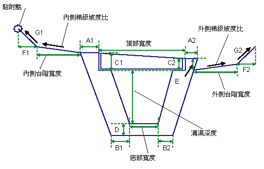 | 外側台階坡度比 | 外側台階 (可選) 的橫向坡度比。從溝渠結構邊緣開始向外對其進行測量,正坡度表示自溝渠的上升台階 | 外側台階坡度比 | 4% |