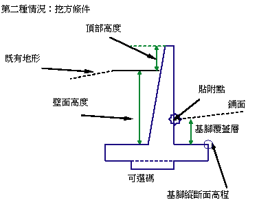 貼附點根據擋土牆處於挖方情況還是填方條件而有所不同。如果其在填方中,則貼附點將位於擋土牆頂部附近。如果在挖方情況下將其插入,則貼附點將位於基腳附近。