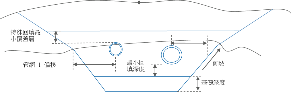 在這兩種情況下,次組合均將根據指定網路中的管位置確定溝渠深度和溝渠寬度。特殊回填最小覆蓋層由取樣橫斷面處的最高管的頂端外徑確定。特殊回填最小深度由取樣樁號處的最低管的較低外徑確定。不管側坡在哪種地形下方,均將使用相應的坡度 (岩石或一般)。