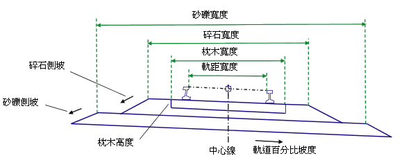 根據提供的輸入參數值計算和放置軌道、枕木、碎石和砂礫的連接。如果「軌道百分比坡度」不為零,則將在低側軌道中心處保留廊道縱斷面高程。將以「軌道百分比坡度」保持完工整地地形、枕木、碎石和砂礫連接。