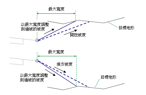 此次組合可插入以使用者定義的開挖坡度或填方坡度建立邊坡至目標地形的連接。