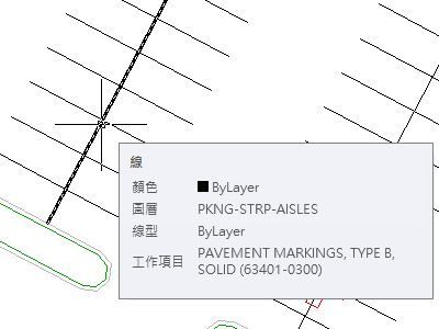 在停車場交通島中會顯示一個實體填充線樣式。這表示工作項目已套用至該區域。