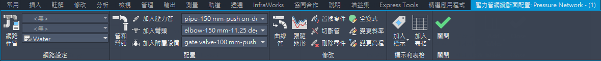 使用「壓力管網縱斷面配置」功能區處理縱斷面視圖中的壓力管網。