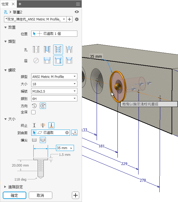 「性質」面板工作流程從上方流向下方。亦即,您設定或變更的任何性質都可能會影響其下方區段中的性質,但這些性質不會影響前面區段中的性質。 改進的標註順序可讓您更快輸入孔的值。 預置可讓您建立和重複使用常用性質集。 |