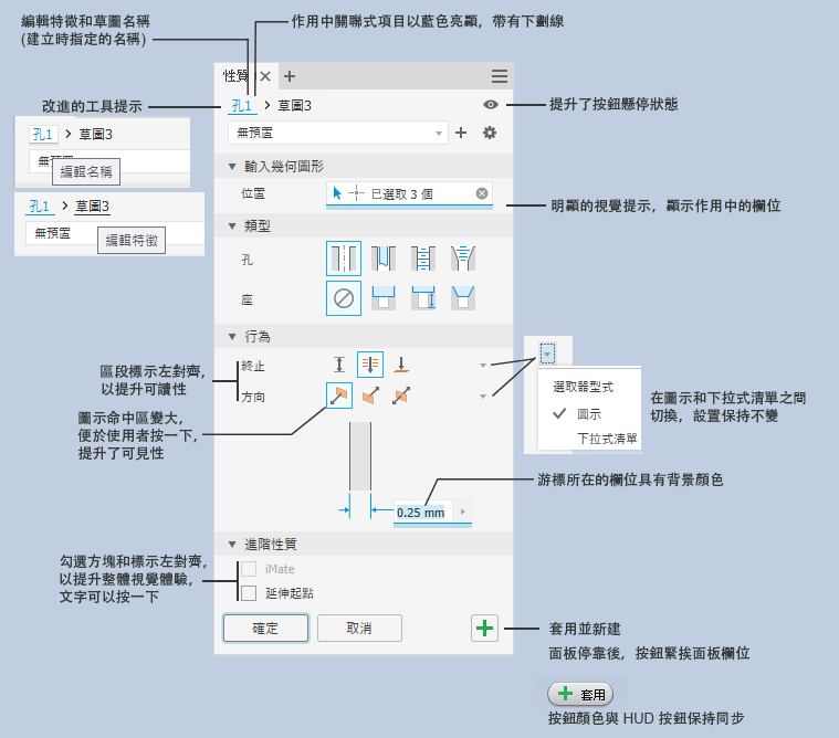 Inventor 使用者介面的各個部分已經過更新,來更新它們的顯示。