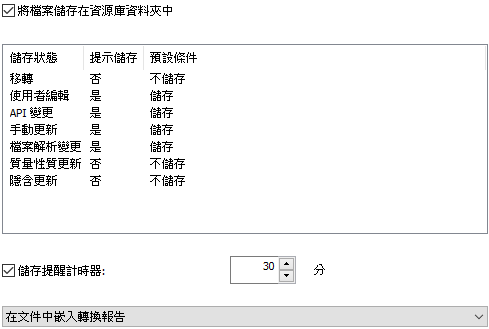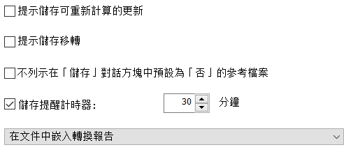 儲存狀態提示取代了「提示儲存可重新計算的更新」、「提示儲存移轉」以及「不列示預設為『否』的參考檔案」選項。