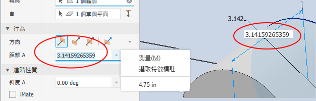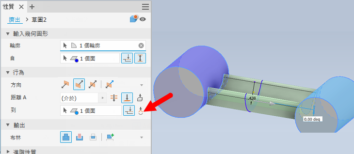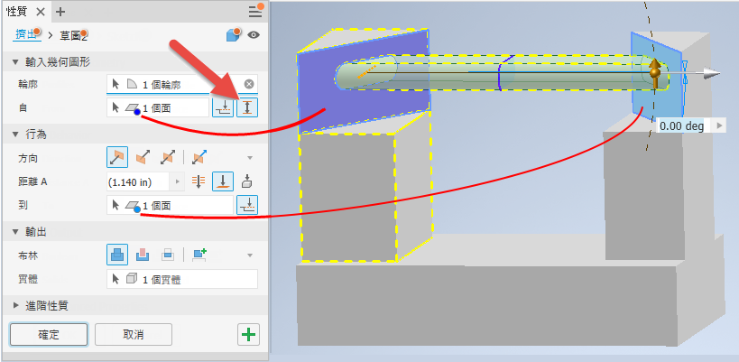 已在「擠出」指令中加入 「介於」選項。勾選後,該選項會聚焦於選取「從」/「至」面,以加速建立程序。