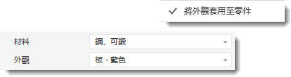 已在「插入」、「變更」、「重複使用」和「變更重複使用」的「進階設定」功能表中,加入了「將外觀套用至零件」選項。啟用此新選項,可以使框架零件與組合的顏色相同。先前,框架零件未使用組合的外觀顏色。