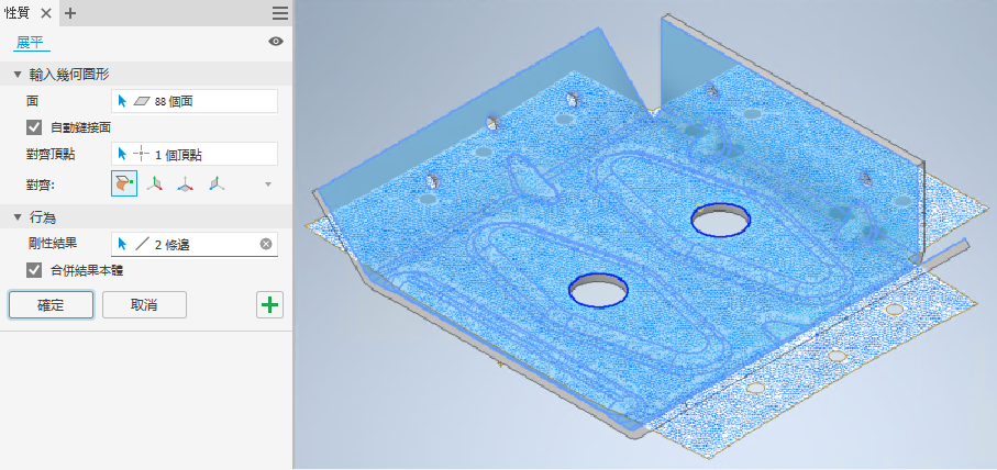 此版本進一步增強了「展平」指令;您可選擇將結果與模型對齊,或與 XY、XZ、YZ 平面對齊。您也可以選取多個要設為剛性的平面孔。