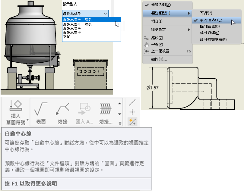 - 「線型式」現在稱為「顯示型式」,其中提供更多選項,讓您對圖面中材料表參考零件的外觀進行更精細的控制。使用新選項「邊設為參考,描影」或「邊設為零件,描影」,以具有或不具有虛線外框的顏色展示參考檔案。