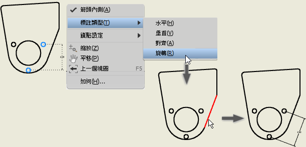 - 「標註」指令中新的「旋轉」選項,可讓您將標註與所選邊互垂對齊。