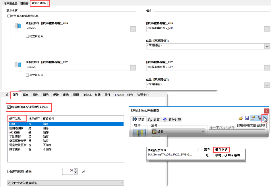 - 儲存檔案時,我們已啟用新選項,以設定有關是否應儲存檔案的預設行為。儲存對話方塊中有一個新的「儲存狀態」欄,可協助您瞭解 Inventor 提示您儲存哪些檔案,以及原因。