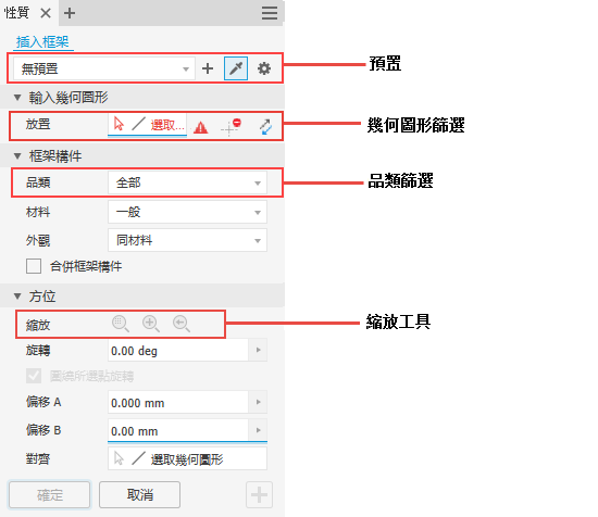 - 建立框架時,一個新品類篩選可讓您簡化選取;「預置」可協助您儲存最常用的框架設定,以便稍後再次使用。