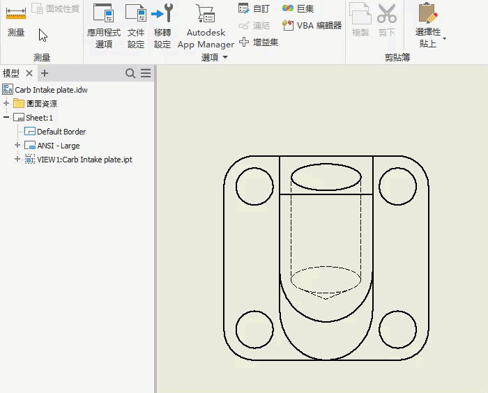 使用新功能區指令 「註解」頁籤 「符號」功能區面板 「中心線」,為選取的視圖指定中心線行為。預設中心線行為從「文件選項」對話方塊的「圖面」頁籤進行定義。若要變更個別視圖的模式,請選取視圖並規劃設定。