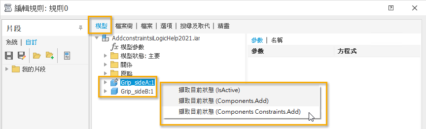 在「規則編輯器」的「模型」樹中選取多個元件,可同時擷取多個元件的狀態。如果您要擷取元件之間的約束,此動作可確保僅需擷取一次。