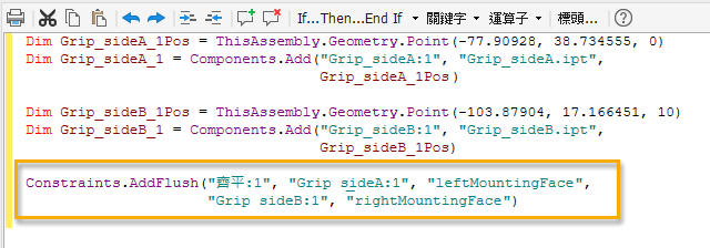 多個新的 iLogic 組合函數可讓您更輕鬆地編寫規則程式碼,以加入、修改及刪除元件和約束。以下是一些範例: