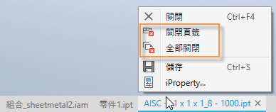 使用新的「關閉頁籤」和「全部關閉」關聯式功能表選項,可快速關閉所有開啟的文件。可從所開啟頁籤的關聯式功能表存取新選項。