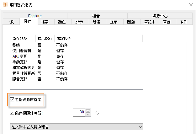 為了清晰起見,「將檔案儲存在資源庫資料夾中」勾選方塊已更名為「包括資源庫檔案」。一般而言,「儲存」頁籤可讓您控制希望系統提示您儲存的編輯類型,而「包括資源庫檔案」設定可讓您控制是否要在提示中包括資源庫檔案。