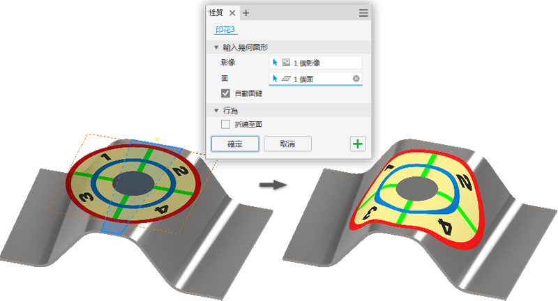 若要取得有關印花的更多資訊,請參閱〈浮雕或加入印花至零件或曲面〉