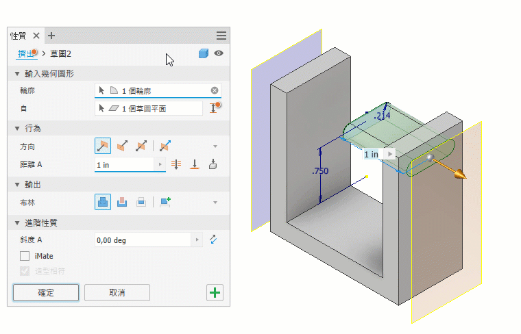 對於具有「推拔」參數的指令 (例如「擠出」),如果使用「到」/「到下一個」/「通過全部」選項,則當您在「性質」面板中按一下「推拔」值編輯欄位時,會啟用「推拔」圖元區控制。