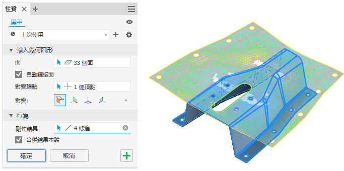 若要取得有關使用「鏡射」指令的更多資訊,請參閱〈以陣列排列零件特徵〉。