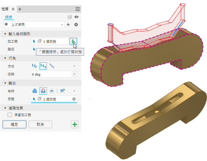 除了用於簡化工作流程的新性質面板,「實體掃掠」還允許您沿著路徑掃掠實體加工體。以下範例展示了沒有扭轉的固定掃掠路徑,以模擬一個工具路徑。