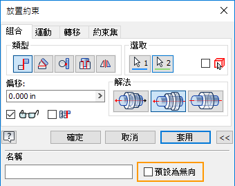 依預設,在建立軸向約束時,Inventor 會嘗試預測建立約束的最佳解決方案。新的「預設為無向」設定可讓您永久回復至舊式行為 (預設為無向)。