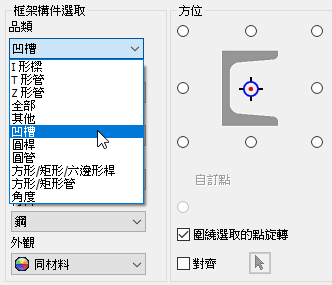 在「插入」和「變更」指令中,在「框架構件選取」中加入了一個新的「品類」區段,以改善對特定族群的搜尋。當您選擇結構造型品類時,會篩選族群清單以僅展示可用的選擇。