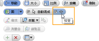 在主要「直接編輯」小工具列中,已為所有作業(「移動」、「大小」、「比例」、「旋轉」和「刪除」)加入預覽按鈕。