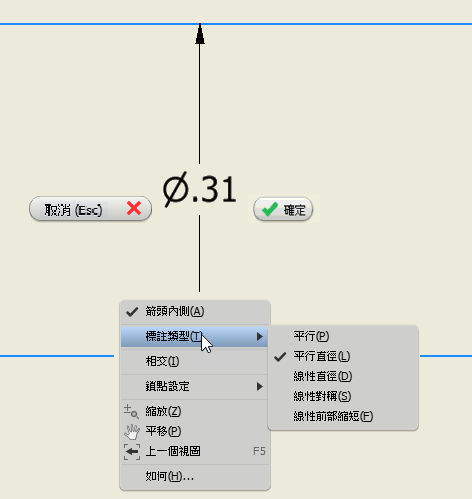 選取圓柱特徵 (軸或孔) 的剪影邊時,會建立新的標註類型 (帶 Ø 符號的平行直徑)。