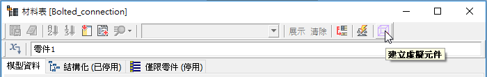 使用「建立虛擬元件」這一新選項,可從「材料表」對話方塊建立虛擬元件。虛擬元件會顯示在組合瀏覽器的底端。