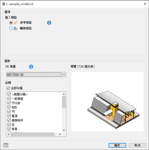 現在,您可以選取 3D 視圖,並除選要包括的品類,以指定要在匯入模型中包括或排除哪些 Revit 品類,然後再匯入模型。