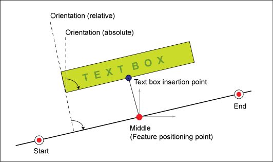 Use the label positioning and orientation settings to specify the label location relative to the feature geometry. These settings establish the location of a text box insertion point with reference to a start, middle, or endpoint of the feature.