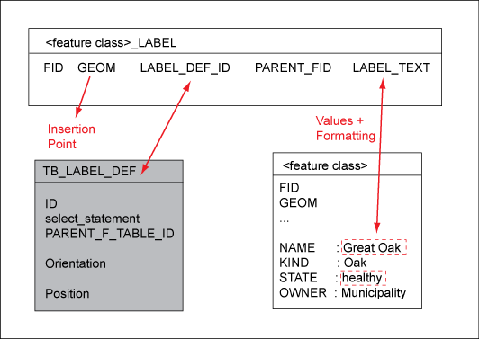 Data Model: Relations between feature table and label feature class. The attribute itself (name of the tree = Great Oak) is saved with the feature. To display this value as text in graphics, generate labels.
