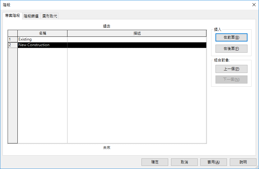 「階段」對話方塊開啟,顯示「專案階段」頁籤。依預設,每個專案均有稱為「既有」和「新營造」的階段。