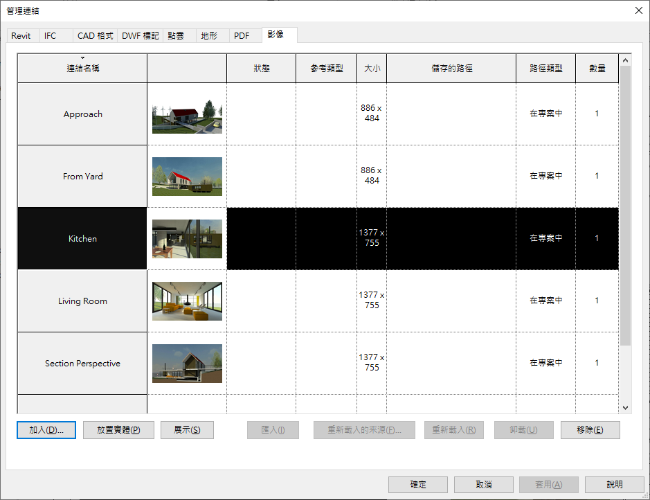 您也可以使用「管理連結」工具,上傳並取代 Revit 專案中既有的連結和影像。您在「管理連結」工具中的變更,將會更新您團隊夥伴的 Revit 檔案中的影像和檔案。