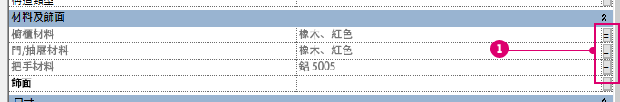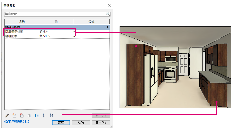 (整體參數)。選擇其他材料,該材料就會套用至廚房的櫥櫃。您不需要再分別修改每個族群的類型參數。