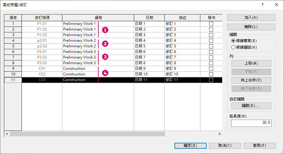 例如,假設您處理的專案需要您在設計階段追蹤修訂,並在營造階段分開追蹤修訂。每次發出一個設計檢閱套件時,修訂都會以字首 P1、P2、P3 等標示... 每個修訂都會標示一個供檢閱的文件版本。在每個版本中,您都需要記錄對專案所做的細微變更。兩個設計檢閱版本之間所做的變更,會使用設計檢閱的字首後接一個兩位數字來追蹤。