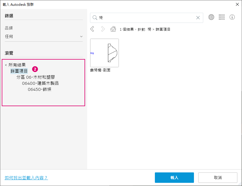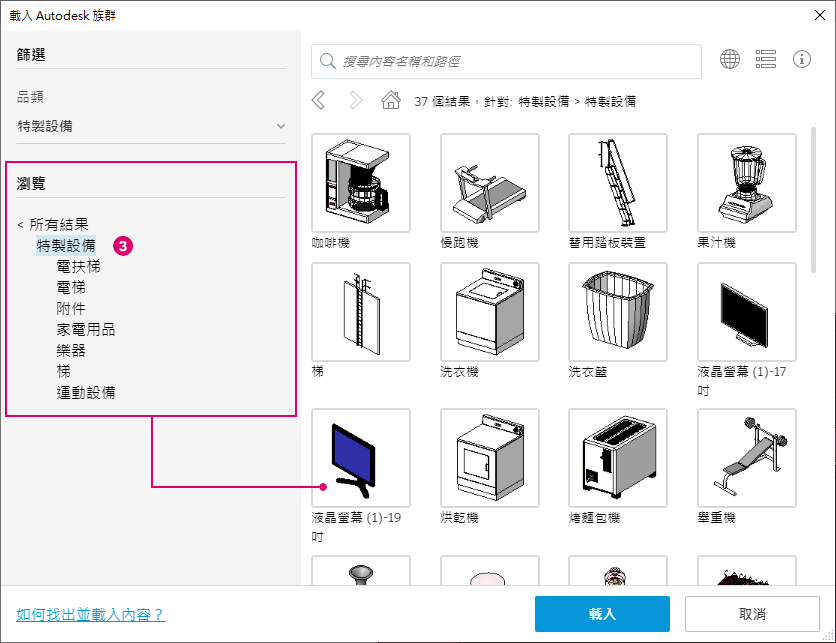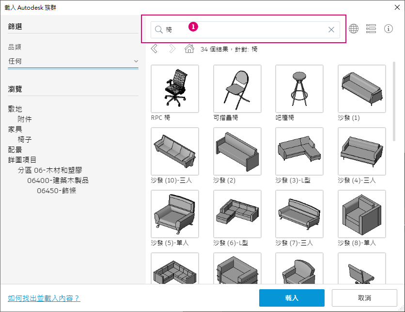 找到族群後,若要載入到專案中,請在族群瀏覽器中選取該族群,然後按一下位於視窗底部的「載入」。選取的族群會載入到作用中的 Revit 模型,且瀏覽器會關閉。若要載入其他族群,請重複此程序。