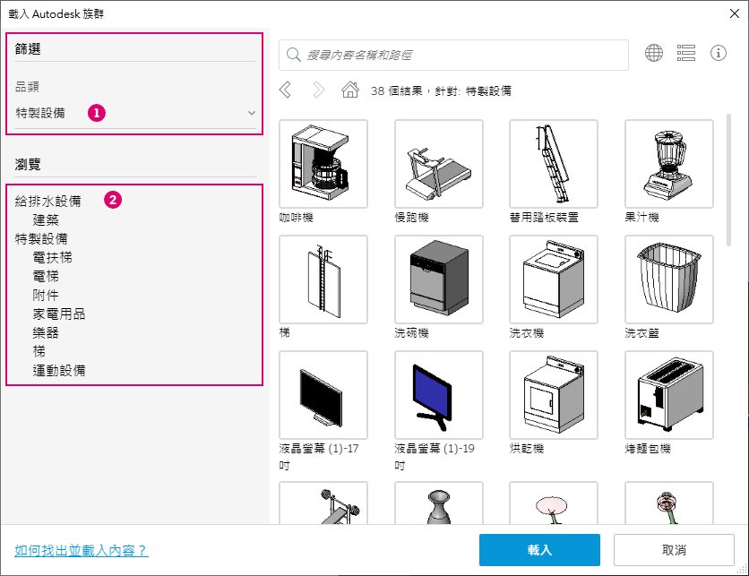 「載入 Autodesk 族群」是在 Revit 2021 中以技術預覽方式引入的工具。此工具會開啟專用的內容瀏覽器,讓您搜尋所有語言及區域的 Autodesk 範例內容。找到要尋找的內容後,即可將其從瀏覽器直接載入到模型中。