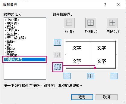 。在「編輯邊界」對話方塊中,選取線型式,然後按一下套用線型式的位置按鈕。在此範例中,只有下邊界指定較寬的線型式。