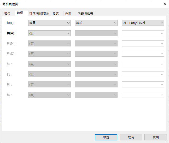 「樓層」參數必須包含在明細表中,篩選才能運作,但不需要顯示。按一下功能區上的「隱藏」