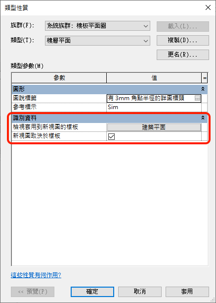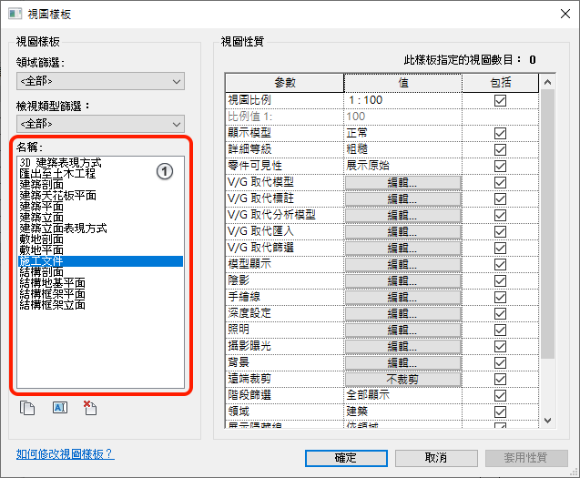將樣板性質套用到目前視圖 - 選取樣板並將樣板的可見性設定套用到目前視圖。
