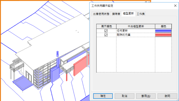 協同合作顯示模式可讓您查看模型中元素的狀態。控制項可讓您從一種模式切換至另一種模式,以取得模型的完整圖片以及目前正在使用模型的人員。此資訊可讓您與團隊進行溝通和協同合作。在複雜專案中,如果有多個團隊成員,這些顯示模式將節省瞭解模型完成工作的時間。您可以避免提出編輯請求並等待團隊成員回覆,而是在提出請求之前使用顯示模式查看元素的狀態。沒有任何方式可以取代團隊的直接溝通,但是協同合作顯示模式可協助您瞭解和協調模型已經完成的工作。