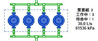 當您建立機械套組時,可以指定工作中的泵數目和待命中的泵數目。此資訊將供正確設定尺寸的分支和泵套組的集水管在計算流量與壓力降時使用。