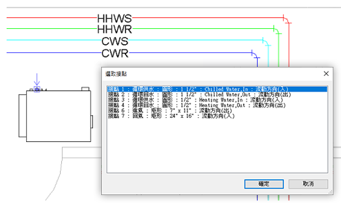 如果新元件可以連接至多個系統,則「選取接點」對話方塊即會開啟。每個配管接點都會列示其索引號碼、系統分類、造型、大小、接點描述和流向。接點描述可用於指示應指定給接點的系統類型。箭頭顯示所選接點的位置和方向。