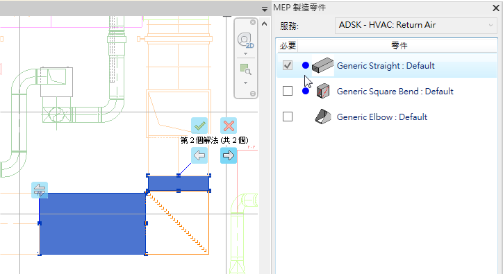 「MEP 製造零件」選項板會顯示用於可用解決方案的所有零件。藍色圓點表示零件是用於目前選取的解決方案中。當您將滑鼠指標定位在清單中的某個零件,該零件會在繪圖區域亮顯。在「MEP 製造零件」選項板中,選取勾選方塊,以篩選可用配件的清單並限制解決方案的數量。