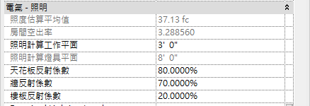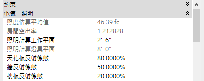 樓板 (pf)、牆 (pw) 和天花板 (pc) 反射係數為空間例證的所有性質,而且 RCR 會依上述項目計算。您可使用內插來計算 CU 大約為 40.8。Revit 報告值為 40.9,差異極可能是因為列印表格中的捨入值。