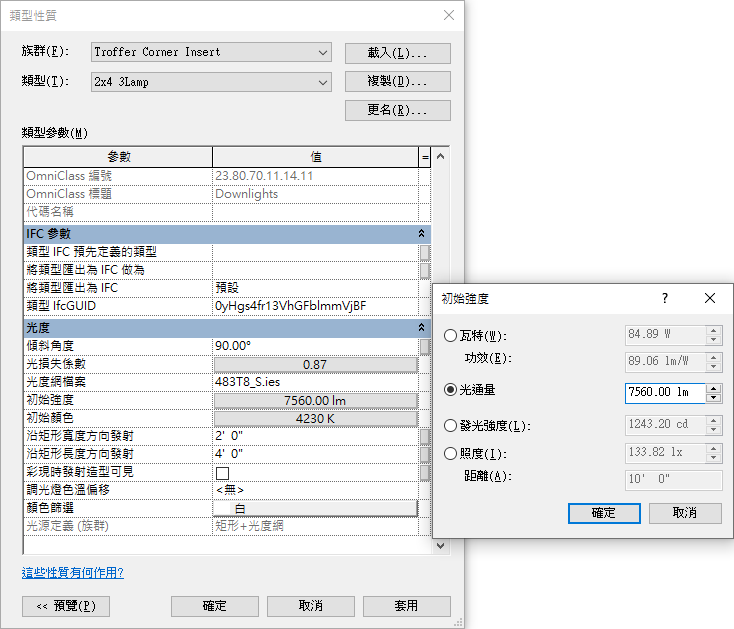「初始強度」和「光損失係數」均為每個照明裝置類型的類型性質。您可以在裝置的「類型性質」對話方塊中存取這些性質。
